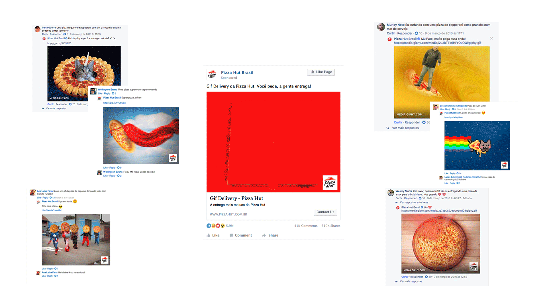 Transformamos o facebook da Pizza Hut em uma central de gifs. Os seguidores faziam pedidos pelos comentários e a gente entregava em alguns minutos. O resultado? Uma ação divertida para todo mundo.